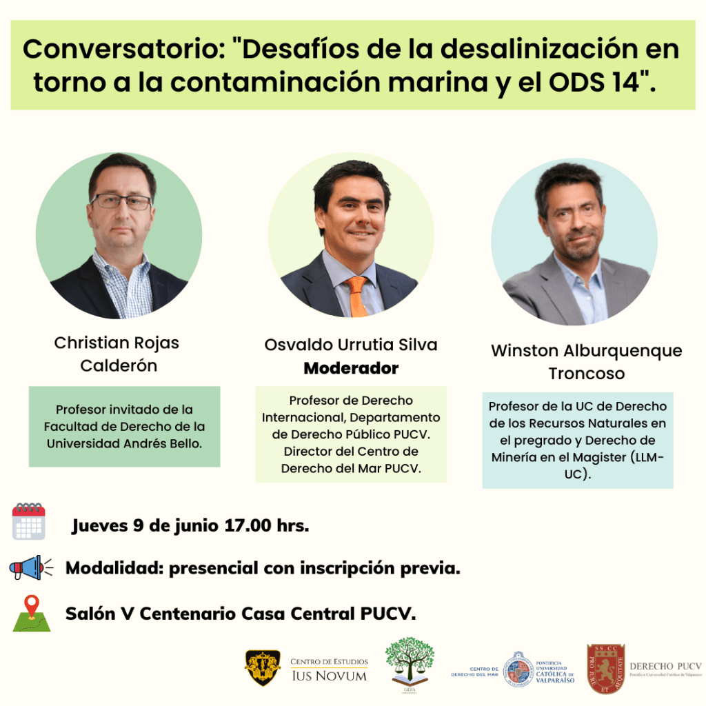 Les extendemos la invitación para asistir al Conversatorio que versará en torno a los Desafíos de la Desalinización organizado en conjunto con el Grupo de Estudiantes en Formación Ambiental (GEFA) y el Centro de Derecho del Mar de la PUCV.